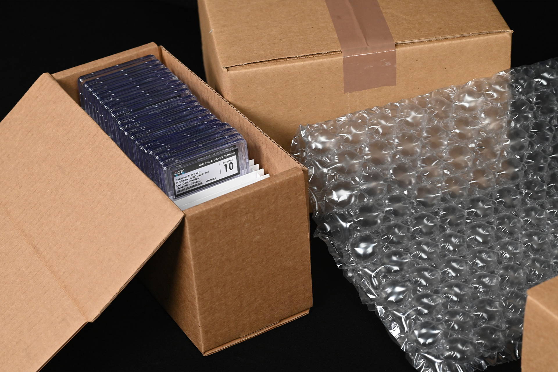 Encapsulated cards are securely packaged in a sturdy box with protective packaging. The CGC-certified cards are now ready to be sent back to the submitter.