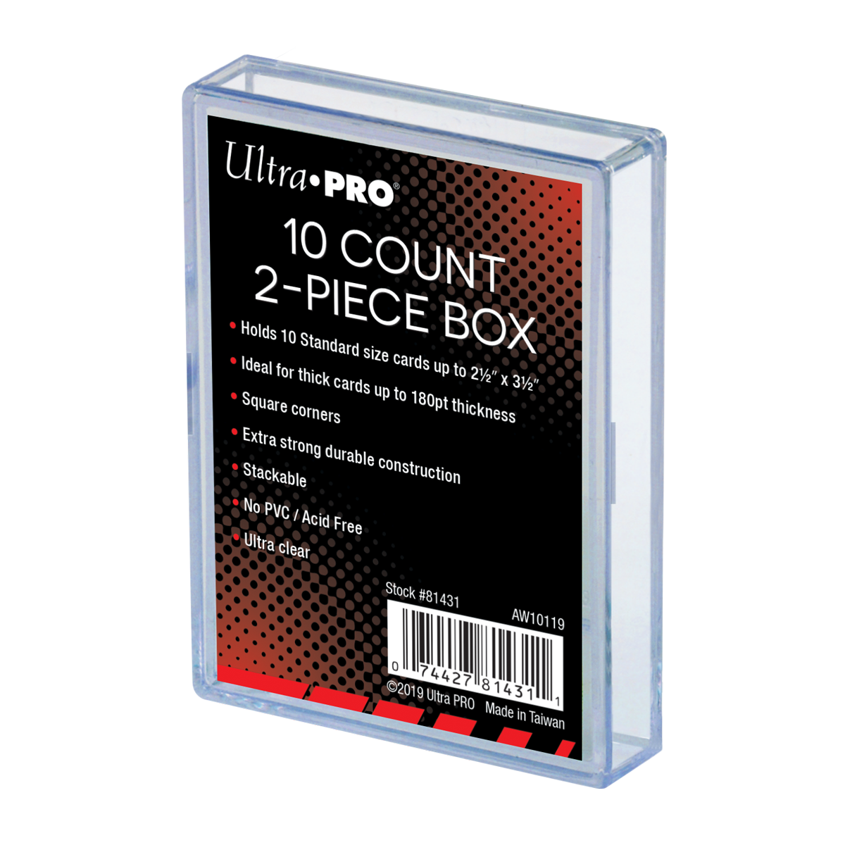 Ultra-clear, heavy-duty boxes have snug fitting semi air-tight closures. This 2-piece box holds up to 10 Standard Size cards. Square corners to help prevent damage to card corners. Stackable for easy organization and storage.
