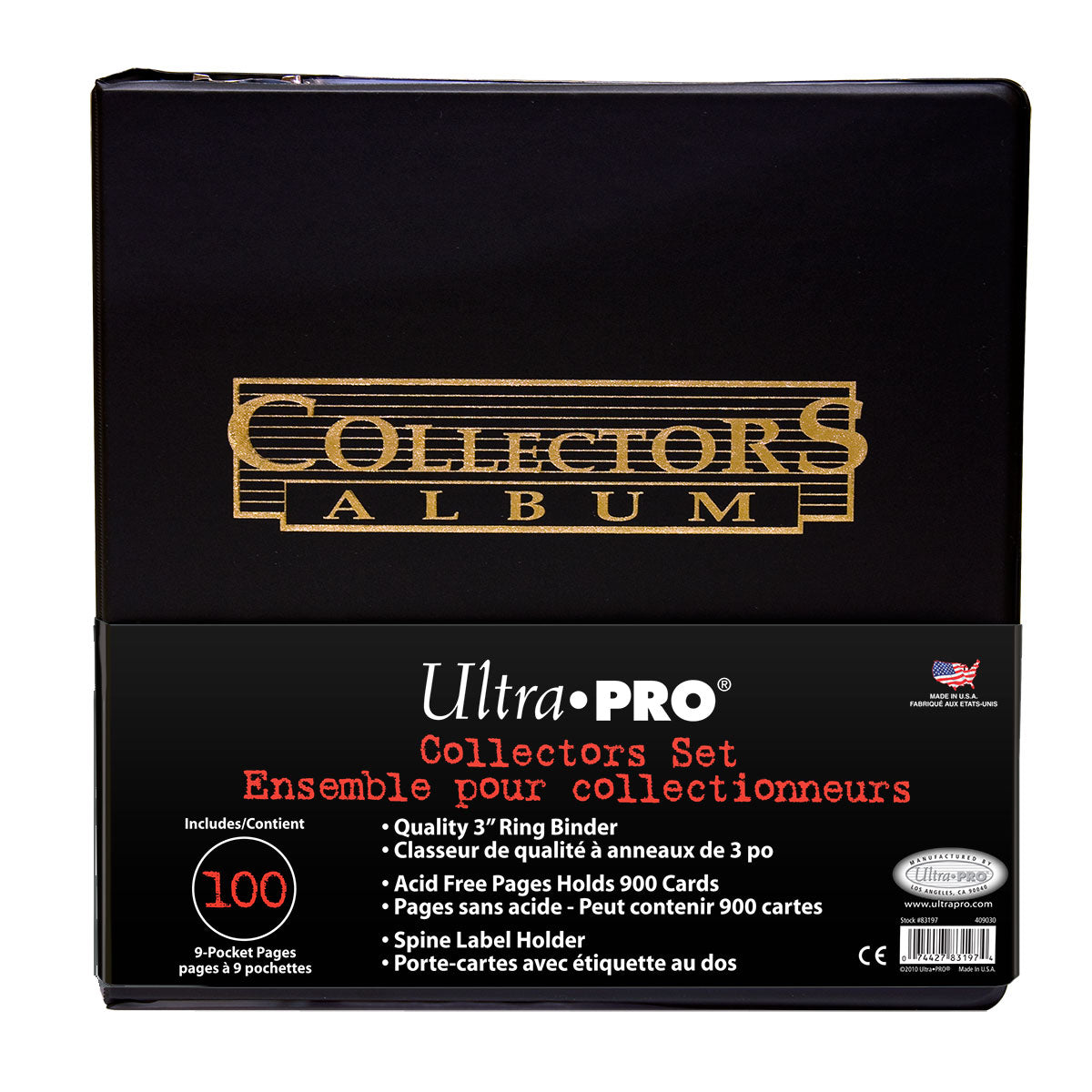 Premium album for standard size pages with collector's themed hot stamp gold foil on black cover. Reinforced 2" D-ring with booster for quick loading of pages. Albums include rich foam padding. Constructed with a clear indexing slot on the spine for easy organization. Includes 100 count 9-pocket pages for trading cards.