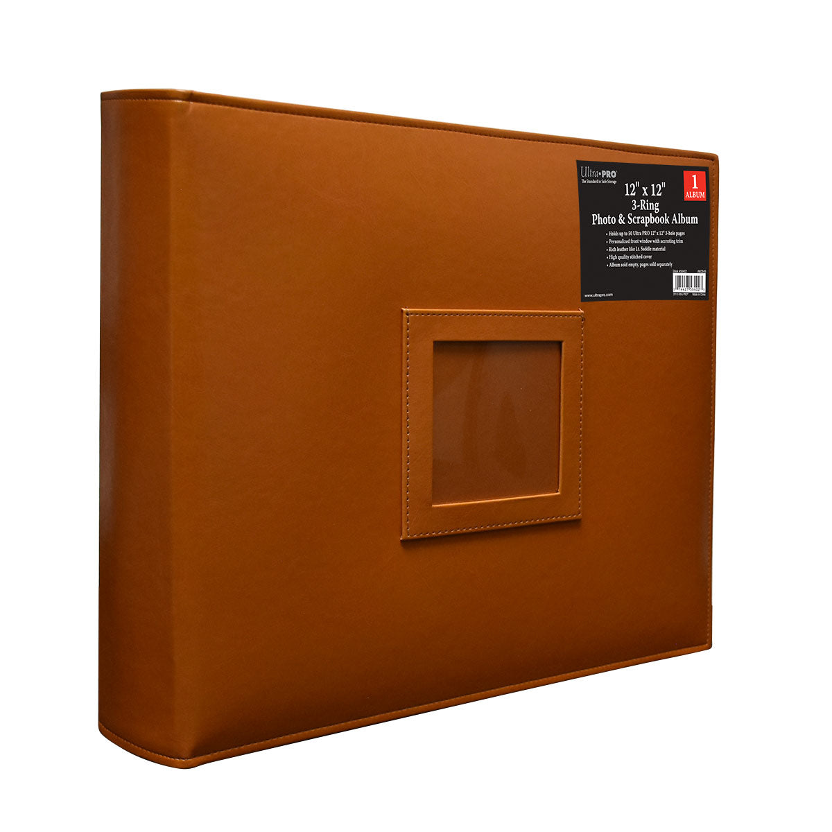 Ultra PRO's Light Saddle 12” x 12” Standard 3-Ring album with 1 ½” D-style rings and boosters. Elegant, contoured spine, holds up to 50 pages (sold separately). The front cover window can be personalized to display your favorite photo. (Pages not included)