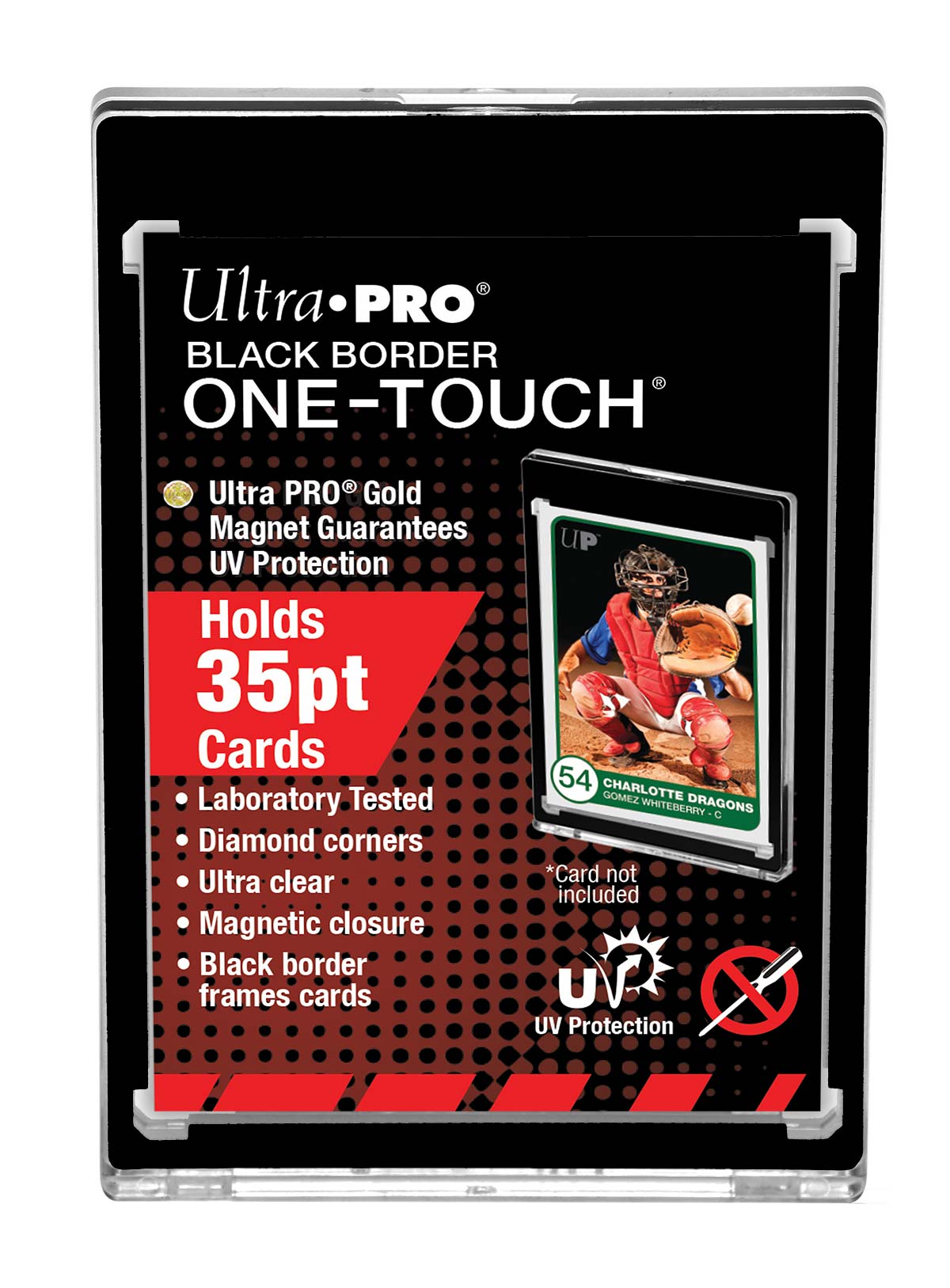 The Black Border ONE-TOUCH® display features a black border to perfectly frame your cards. Designed as the final destination for your collectible cards, our two-piece ONE-TOUCH® holders are uniquely designed with slide-in hinge and magnetic closure so you'll never have to use a screwdriver again. The holder provides UV-resistant, no-PVC and acid free protection to ensure your valuable hit retains its condition while under display. Our ONE-TOUCH® holders are ideal for presenting prized and super rare gaming cards as well. This model can hold standard cards (2-1/2" X 3-1/2") up to 35pt in thickness.