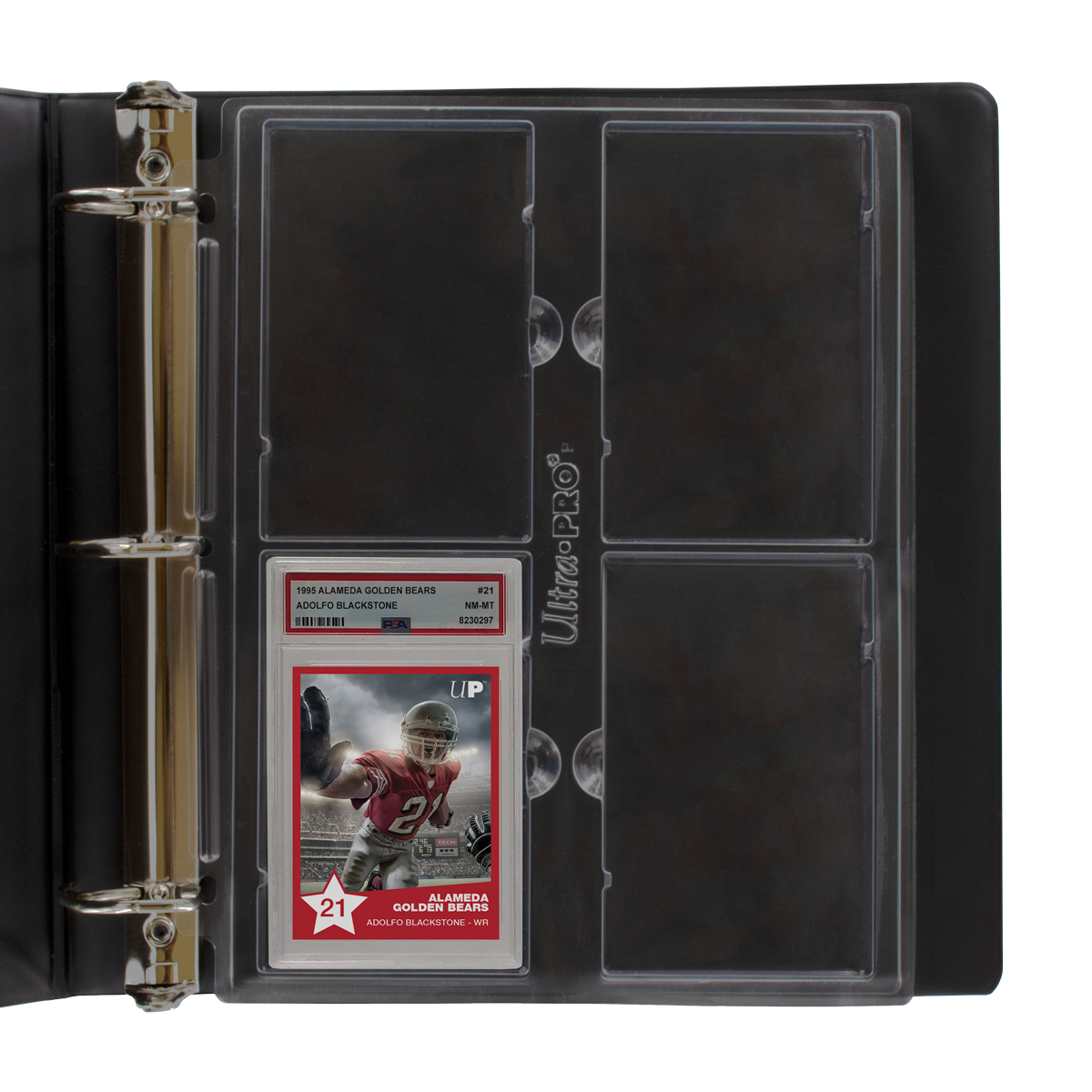 Why store your collectible cards in a box when you can easily flip through them in a binder? The Graded Slab Page is the perfect way to store, organize and easily view your graded card slabs in an Ultra PRO 3-ring album. This page is designed to hold 4 PSA graded slabs in a rigid, 3-hole punched page. This page features special lock-in tabs and finger notches to easily remove and reorganize slabs. These pages are a great way to show off your TCG and sports card collection, or easily carry to conventions and signings.
