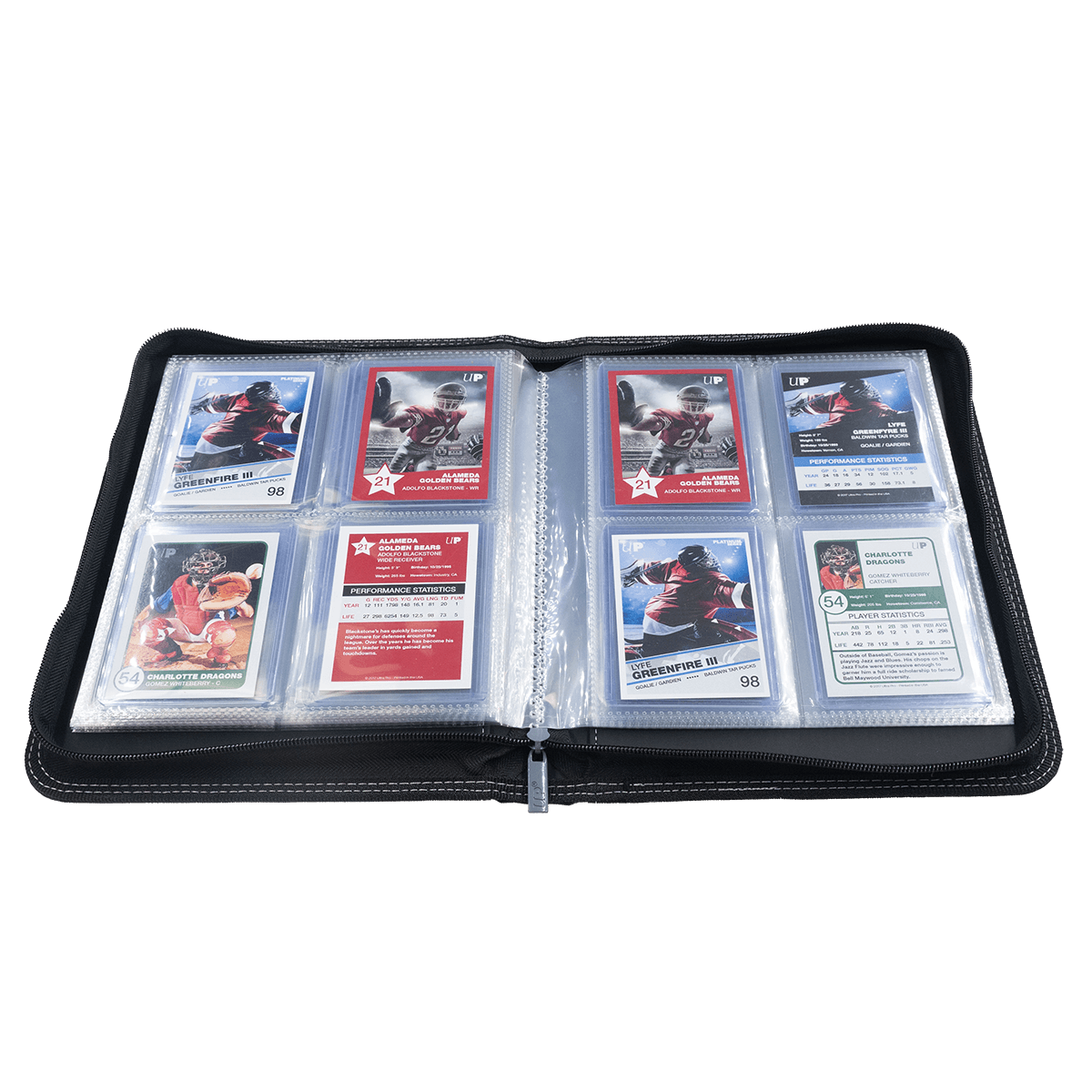 The 4-Pocket Toploader Zippered Premium PRO-Binder is ideal for keeping your sports card collection organized and safe inside of Penny Sleeves & Toploaders. Each PRO-Binder features 20 clear, archival-safe pages, each with 4 side-loading pockets to keep Toploaders in place and ensure that your collection stays clean and protected. They also feature a padded leatherette cover with a matching zipper closure and pull tab. Holds up to 80 standard size cards in standard Toploaders, allowing you to easily view the front and back of your cards.