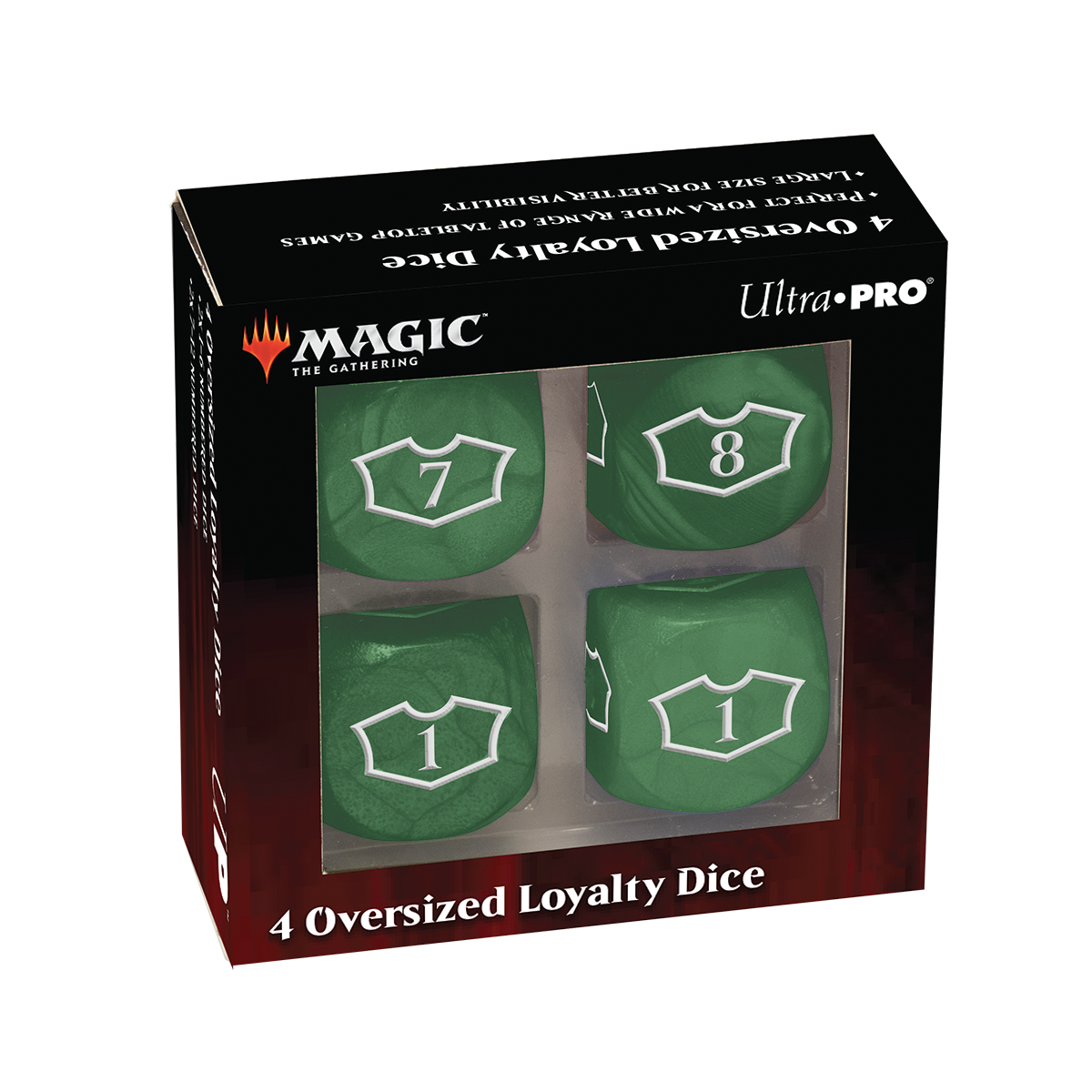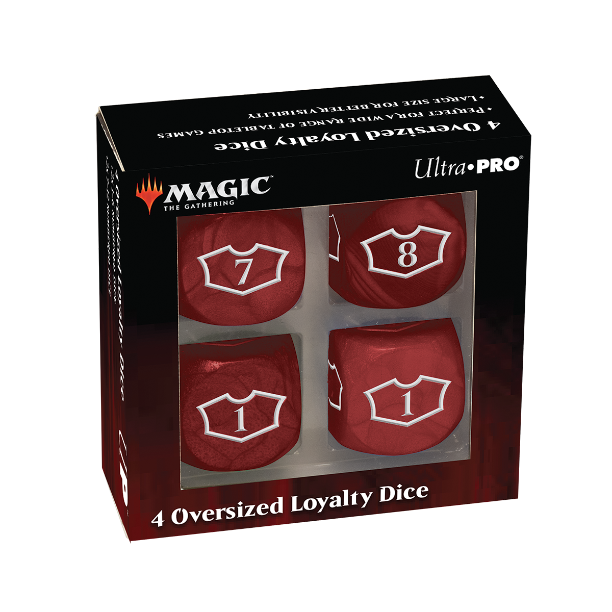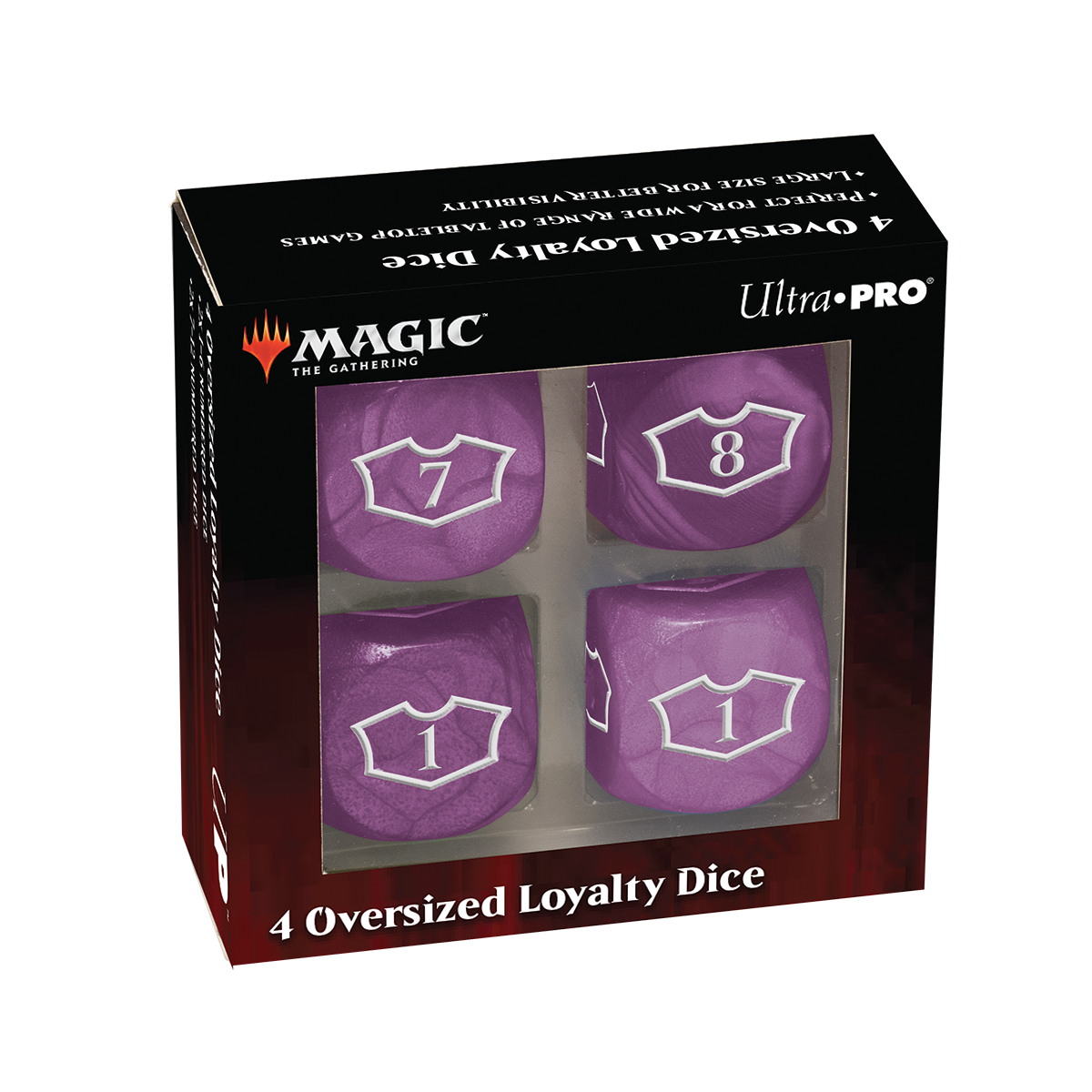 Show your Loyalty with the updated Deluxe Loyalty Dice for Magic: the Gathering! Each face features the iconic "loyalty" outline with numbers 1-6 on two dice and 7-12 on the other two dice, allowing you to save up for that ult with a single die face representing your progress clearly. Each set includes four (4) six-sided dice, measuring 22mm, packaged in a reusable storage box. Rounded corners allow dice to roll further for better randomization and protect gaming table surfaces from dents or marks.