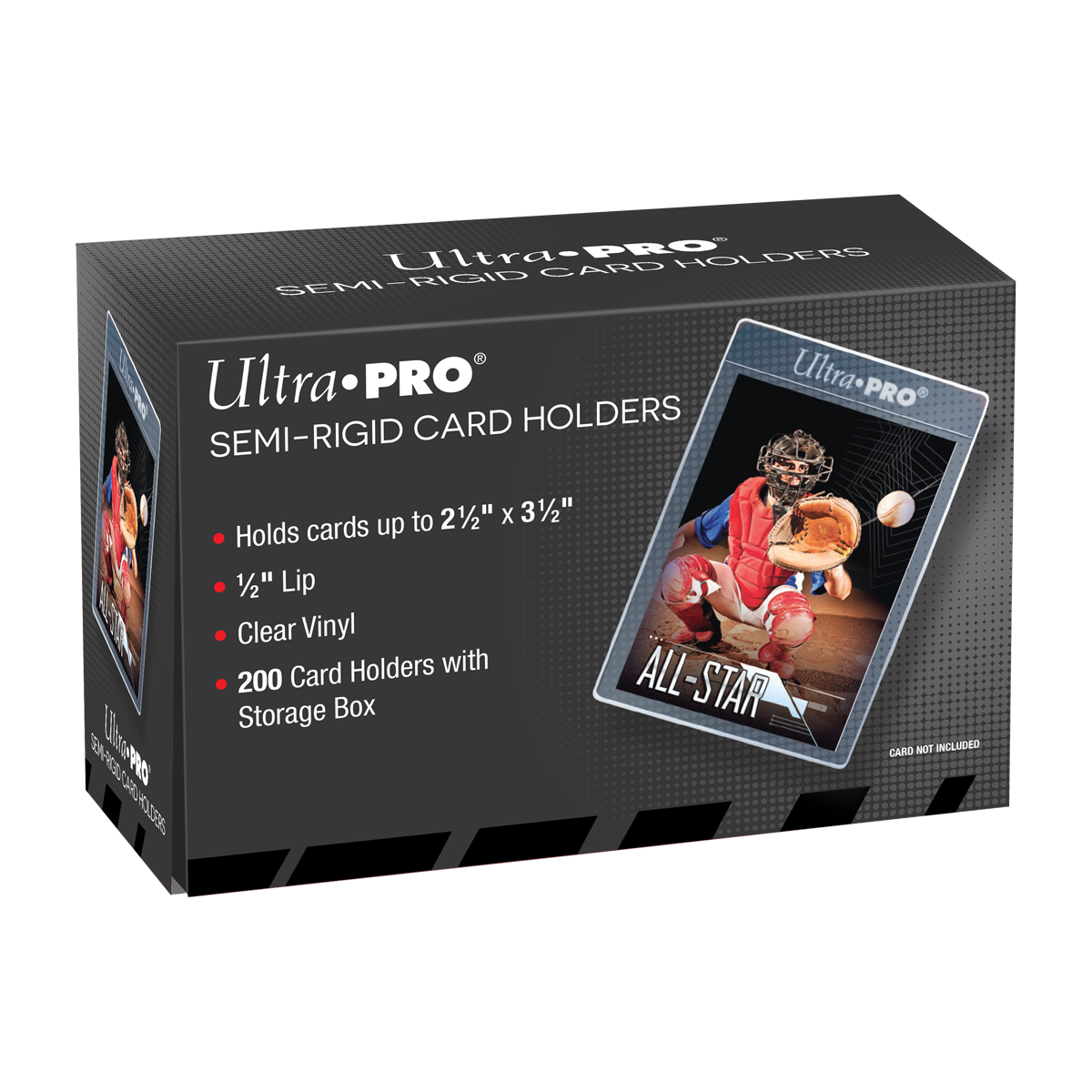 Protect your valuable trading card and gaming cards with Ultra PRO's Semi-Rigid card holding sleeves. These thin yet sturdy sleeves are easy to ship and provide added structural integrity to your card for storage and during shipping. Designed with a 1/2" lip for easy handling and made with clear PVC, these holders store trading cards and gaming cards up to 2-1/2" x 3-1/2" (63.5mm x 88.9mm) in size and up to 35 points in thickness. Each box comes with 200 individual Semi-Rigid sleeves.