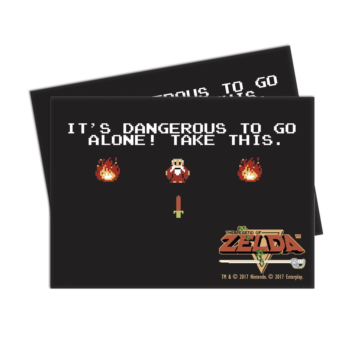 Don't face danger alone - bring your trusty sword with you with The Legend of Zelda standard (Magic, Pokémon) size Deck Protector sleeves, used to protect your tabletop gaming cards during gameplay and featuring that iconic moment from the 1986 The Legend of Zelda video game. These full art printed sleeves are printed with a vibrant, full-color process and made with archival-safe polypropylene film. Each pack comes with 65 individual sleeves.