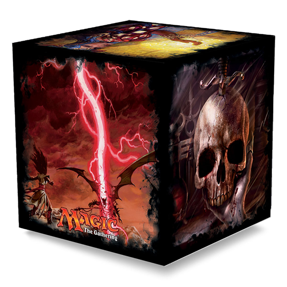 The Magic CUB3™, designed for Cubing, features a unique 2-level storage design. Holds 900 standard double-sleeved gaming cards in Ultra•PRO PRO-Fit & Deck Protector sleeves. Compartment for dice, stones, and other accessories. Secure magnetic closure. 8½” x 8½” x 8½” (215.9mm x 215.9mm x 215.9mm).