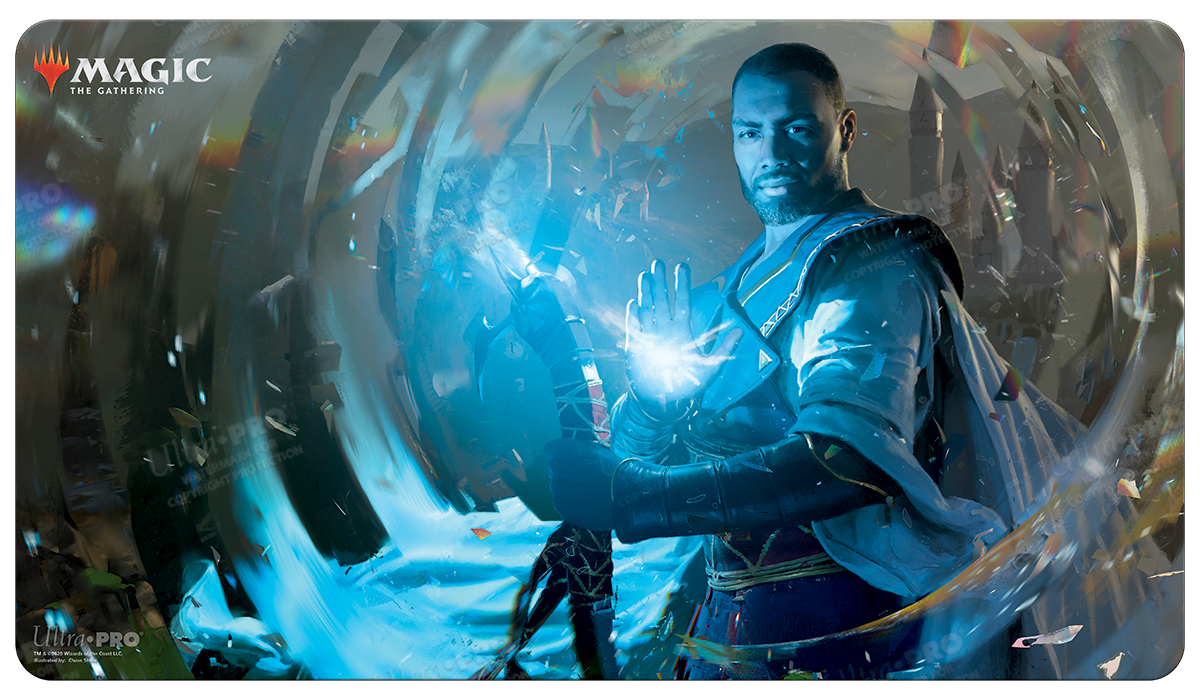 UP your game at your next tournament with these official Magic: The Gathering playmats showcasing highly detailed and vibrant artwork of Magic: The Gathering's "Teferi, Master of Time" from the popular trading card game's M21 set. They are made with a premium fabric top to prevent damage to cards during gameplay for tabletop gamers. With dimensions of approximately 24" X 13-1/2", this playmat is also the perfect decorative oversized mouse pad for computer and laptop workstations. Non-slip rubber backing lets the playmat lay flat and prevents it from shifting during use.