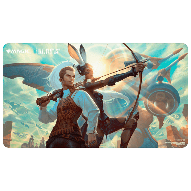 Playmats feature popular Magic: The Gathering®—FINAL FANTASY™ Balthier & Fran artwork and enhance your gameplay experience! Each playmat is made with a soft fabric top to reduce damage to cards, and the non-slip rubber backing keeps the playmat from shifting during use. With dimensions of approximately 24 in. x 13.5 in., a playmat also makes an excellent oversize mousepad for home or office.