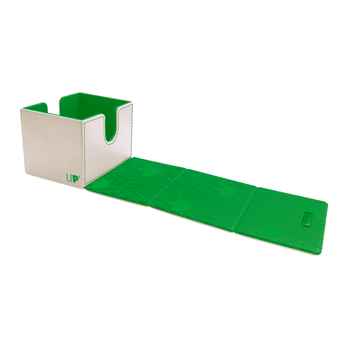 The ALCOVE® Edge Deck Box® for Magic: The Gathering features the iconic Forest symbol debossed onto a leatherette finish, and has dual thumb notches for easy open access to your deck. Store and protect up to 100 standard size trading cards double-sleeved in ULTRA PRO® DECK PROTECTOR® sleeves. The interior features stylized artwork of the Forest symbols on a green background. Strong magnetic closure with a locking mechanism keeps your cards securely stored when not in use.