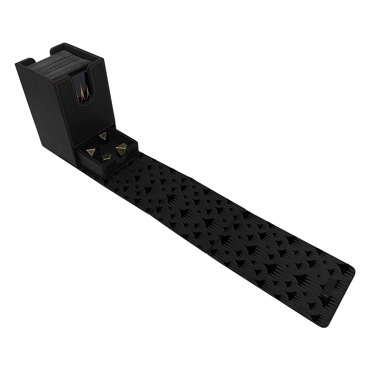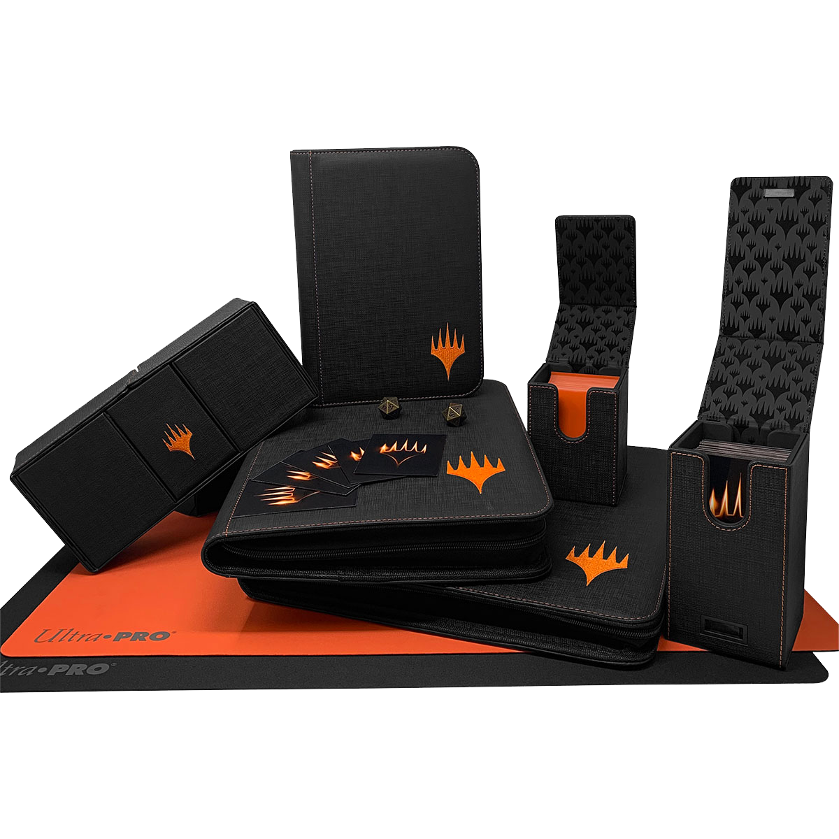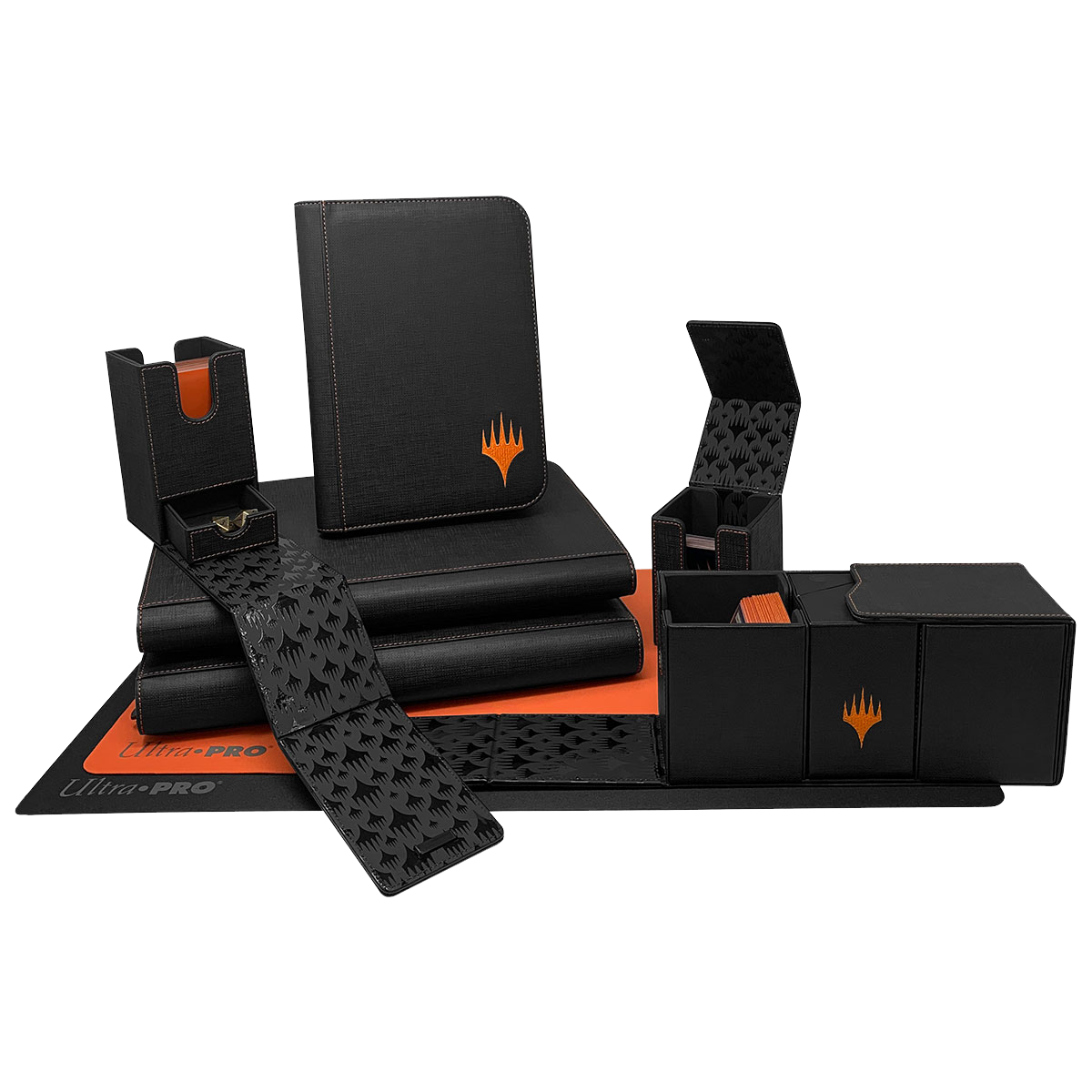 The Mythic Editions are Ultra PRO™s most premium accessories for Magic: The Gathering. This Alcove Tower Deck Box features a black leatherette material with a mythic orange embroidered Planeswalker symbol and matching stitching. Store and protect up to 100 standard size trading cards double-sleeved in Ultra PRO Deck Protector® sleeves. This deck box is made with durable, high-quality materials; features a strong magnetic closure and locking mechanism to securely store your deck; dual thumb notches for easy access when you are ready to play; and a bottom drawer compartment for dice, coins, or other small gaming accessories.
