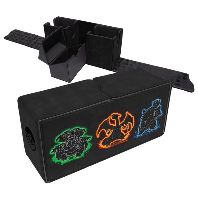 - Features neon-inspired Venusaur, Charizard, and Blastoise artwork