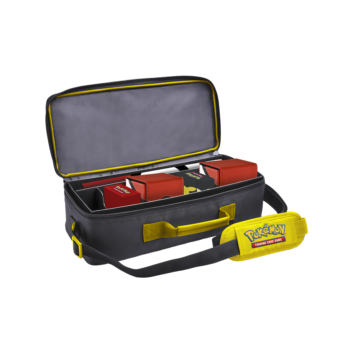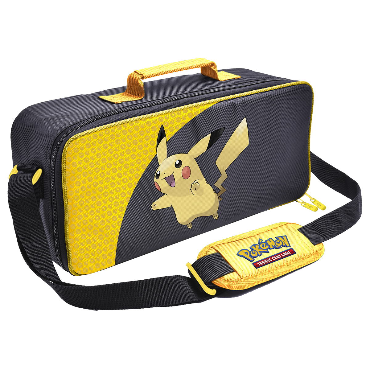The Pikachu Deluxe Gaming Trove by Ultra PRO features vibrant artwork and maximum utility for every Pokémon Trading Card Game player or collector! The adjustable padded shoulder strap extends to up to 60 in. with a briefcase handle option. The Deluxe Gaming Trove provides customizable storage in a durable fabric shell. Each case includes five modular inserts and is specifically designed to store a playmat and several Ultra PRO Deck Boxes. In addition to the iconic Pokémon artwork, the custom zipper pull tab features the Electric Energy symbol. The Pikachu Deluxe Gaming Trove is the ultimate Pokémon TCG companion.