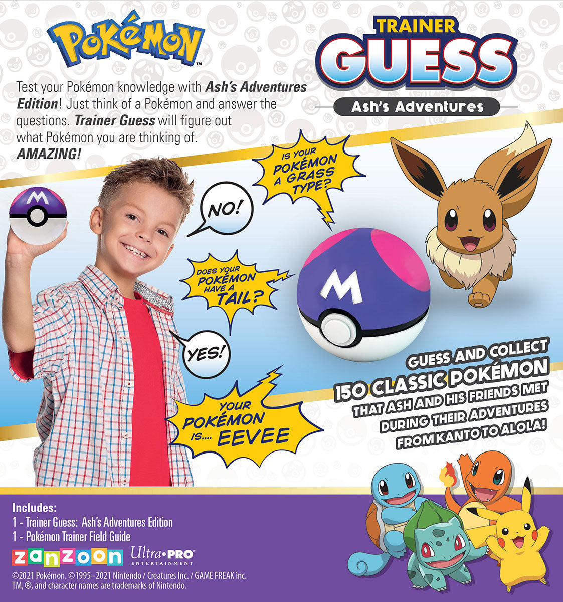 Test your Pokémon knowledge with Trainer Guess! Just think of a Pokémon and answer the questions. Trainer Guess will figure out what Pokémon you're thinking of! No reading or buttons are required to play, simply speak to the Poké Ball and it will understand you and speak back using speech recognition! Guess and collect 150 Pokémon that Ash and his friends met during their adventures!