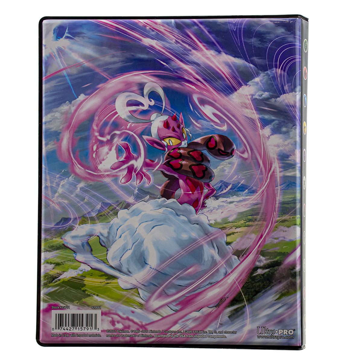 4-Pocket Portfolios for Pokémon feature a vibrant, full-art cover of Hisuian Zoroark and Enamorous. Each portfolio stores and protects up to 40 standard size cards single-loaded and 80 cards double-loaded in archival-safe polypropylene pages. There are also pages in the center of the portfolio to store up to 4 oversized Pokémon cards. Made in California, U.S.A.