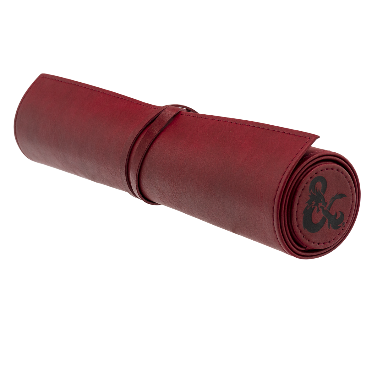 The D&D Dice Scroll Map offers premium dice storage and functions as a dice rolling mat. This Sword Coast Map, illustrated by Deven Rue, is made with a durable Burgundy Red leatherette exterior and a cream-colored backing for the map on the rolling surface with D&D ampersands on each end. This soft roll-out mat will safely store your dice and protect your table. The zippered compartment holds 20+ dice. The rolling mat rolls around the zippered compartment and is secured shut with a single tie to look like an ancient leather-bound scroll. (Dice not included)