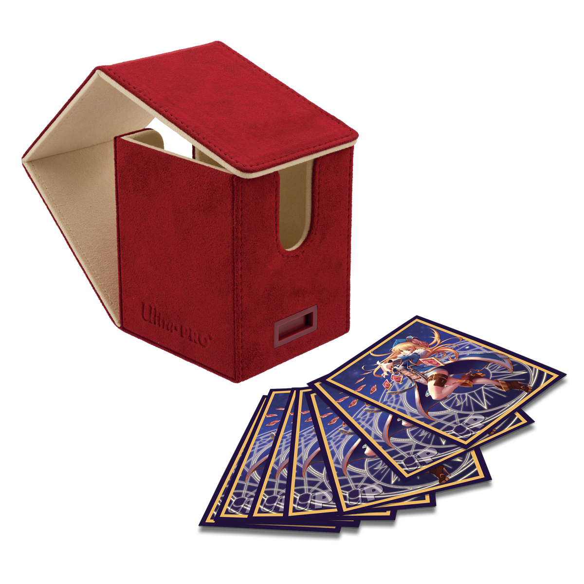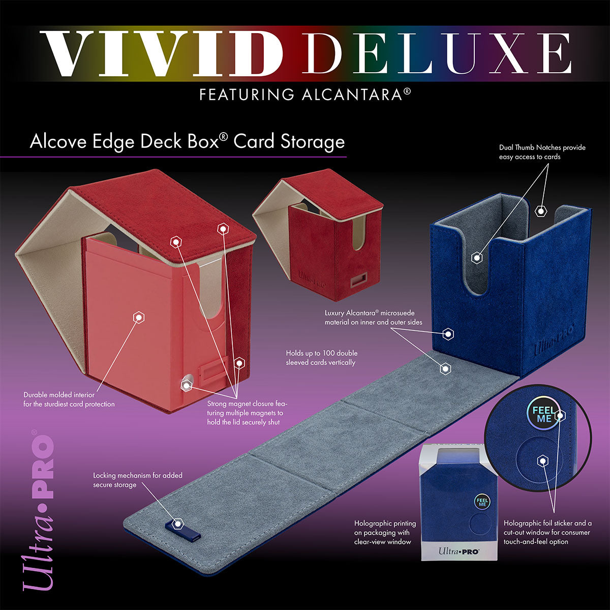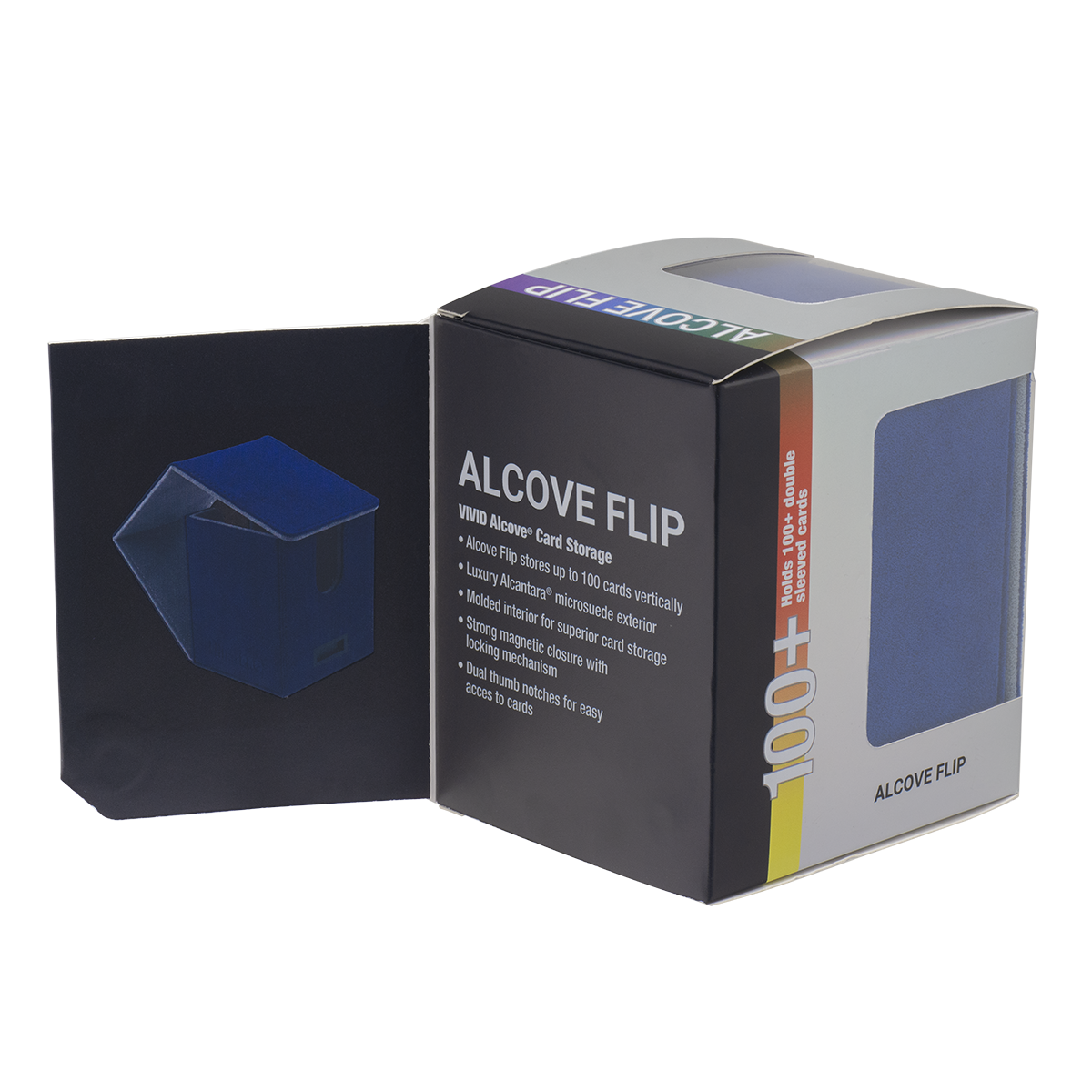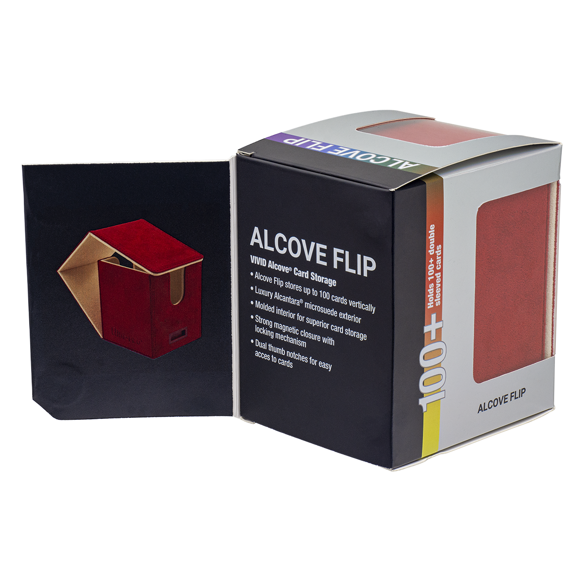 Vivid Deluxe Alcove Flip Deck Boxes feature luxurious, genuine, Italian-made Alcantara microsuede material. Store and protect up to 100 standard size trading cards double-sleeved in Ultra PRO Deck Protector® sleeves. This Deck Box® is made with a durable molded interior for maximum card protection. Dual thumb notches provide easy access to your cards when you are ready to play. Multiple magnets and a locking mechanism keep your cards securely stored when not in use. UPgrade your favorite Magic: The Gathering, Pokemon, Flesh and Blood, or standard size TCG deck with the Vivid Premium Alcove Flip!